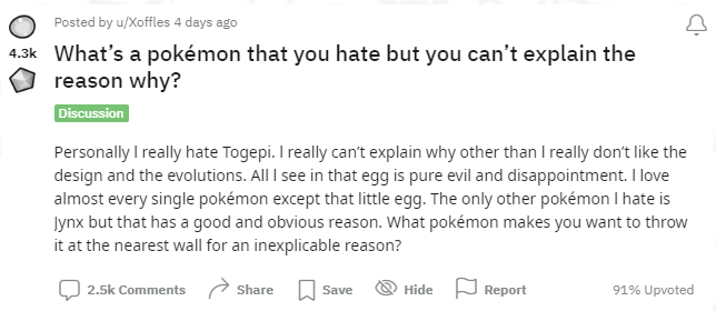 This particular post was created by Redditor Xoffles with the admittedly very controversial choice of Togepi , which he describes as bad and disappointing. Of course, this post went viral and already has about 2,500 comments.